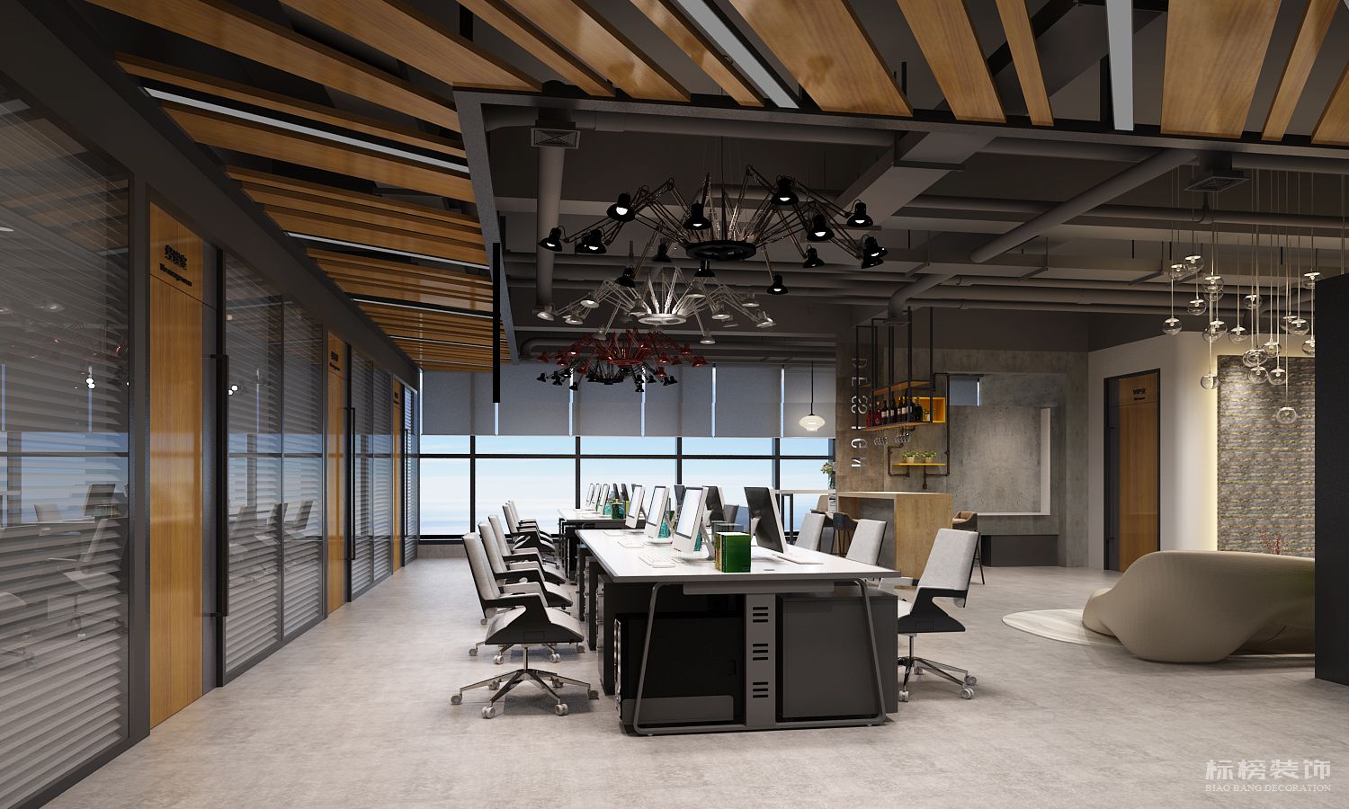 由于是辦公室的設計,有些功能還是需要規(guī)劃的??臻g小想要設計好,是有點難度的,其實這樣的設計可以很好的劃分功能區(qū),對辦公室沒有什么影響,就是采用了一些開放式的設計,隔墻設計或者落地窗設計。